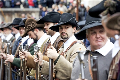 12月8日,在瑞士日内瓦,身着17世纪服饰的“火枪兵”在老城参加登城节活动。