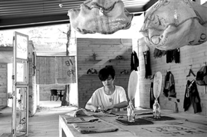 8月7日,赵静把装咖啡豆的麻袋改造为一个包。她曾是一名服装品牌设计师,发现日常生活中产生的大量垃圾会破坏生态环境,为了追求简单纯粹的生活方式,2015年她辞去设计师的职位,来到深圳梧桐山“捡破烂”并改造这些物品。 新华社记者 梁旭 摄