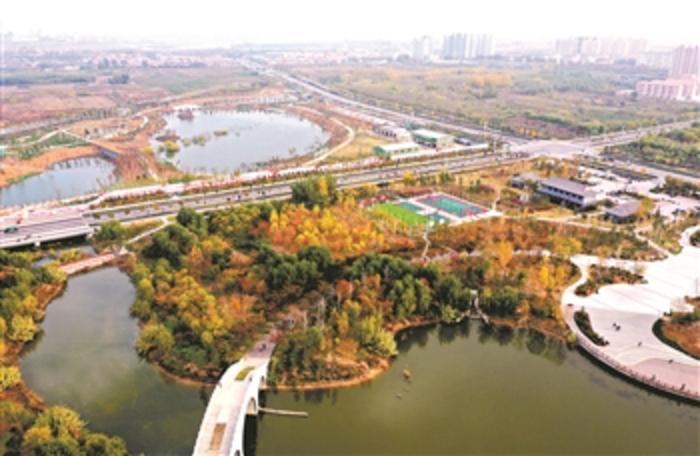 河北邯郸峰峰矿区由采煤沉陷区改造而成的清泉公园(11月12日无人机拍摄)。