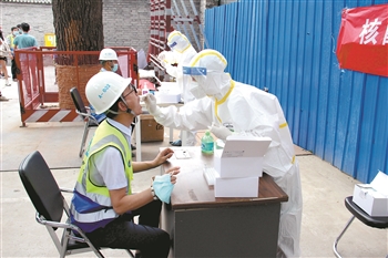 6月17日,在北京东城区某项目工地,工人正在接受核酸检测。