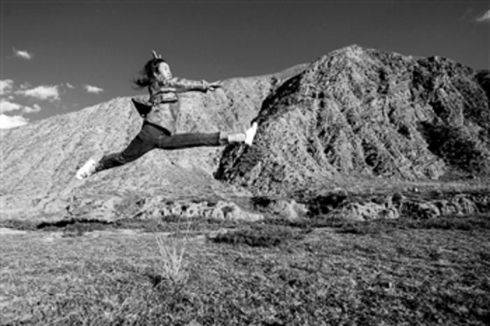 上图:加羊吉在草原上练习舞蹈跳跃动作。