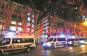 2020年12月31日,警车在法国巴黎香榭丽舍大街集结,为即将到来的宵禁做准备。为防范新冠疫情,法国各地实行宵禁,31日的跨年庆祝活动不被允许。新华社记者 高静 摄