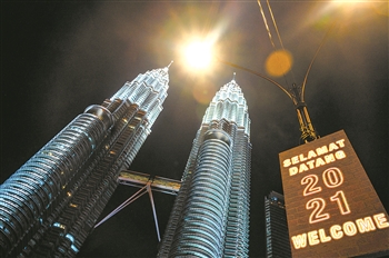 1月1日,在马来西亚吉隆坡马来西亚国家石油公司双塔附近,一块屏幕显示“欢迎2021”。因为疫情防控措施,2021年吉隆坡的新年焰火表演被取消。新华社记者 朱炜 摄