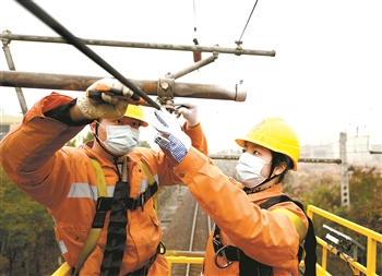 1月27日,在武九铁路瑞昌至白杨畈区段,中国铁路南昌局南昌供电段九江供电车间的女接触网工左信子(右)与同事正在对接触网设备进行检修作业,备战2021年春运。据悉,该段的首批16名女接触网工今年首次迎战铁路春运。胡国林 徐佳奇 摄
