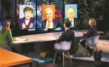 这是1月25日在荷兰海牙拍摄的联合国秘书长古特雷斯(中)等通过视频连线出席首届气候适应峰会。