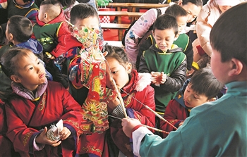 精灵梦皮影艺术团的演员和小朋友们互动(3月19日摄)。