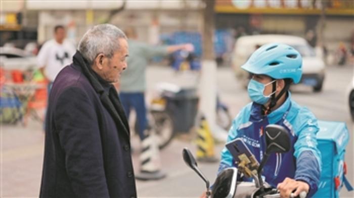 4月10日下午,洪成木在送餐途中遇见一位老人,他主动上前沟通。时时刻刻关注走失者信息,不放过每一个与疑似走失者沟通的机会——这些年来,这已经成为洪成木的习惯。在他看来,送餐、寻人都是正业。 本报记者 李润钊 摄