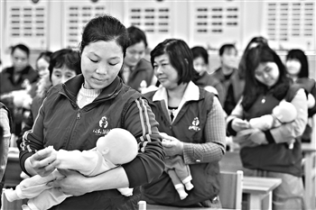 4月9日,在湖南省长沙市长沙县一家职业培训学校,学员们在育婴员培训班上学习如何抚摸婴儿。近期,该县开展免费职业技能培训,通过对接职业培训学校,将免费职业技能培训送到社区,提供育婴员、保育员、茶艺师、保健按摩师等培训班,让居民在家门口提升就业技能。 新华社记者 陈泽国 摄