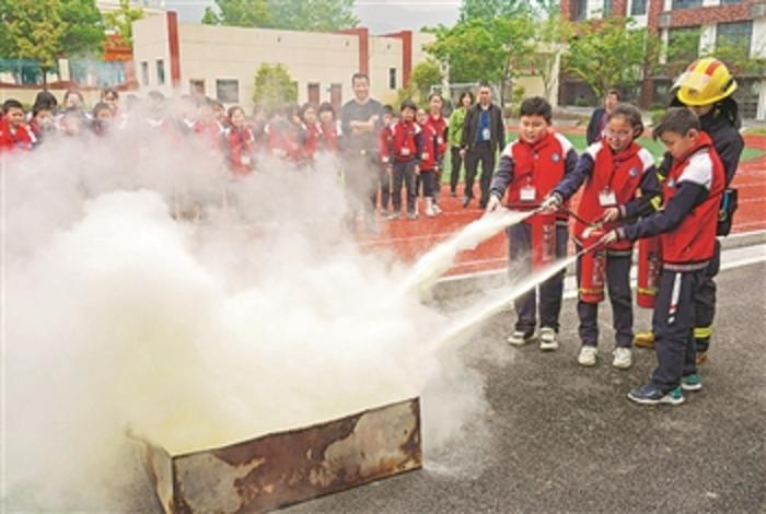 4月14日,湾里五小的学生在消防员的指导下学习使用灭火器灭火。