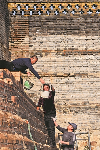 10月13日,工人在山西省洪洞县苗村祖师庙搭建脚手架,准备开展修缮工作。新华社记者 马毅敏摄