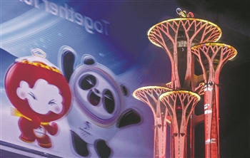 2月3日晚,2008年北京奥运会纪念塔上的春节主题灯光,与北京2022年冬奥会主媒体中心的吉祥物巨幅画面相映成趣。
