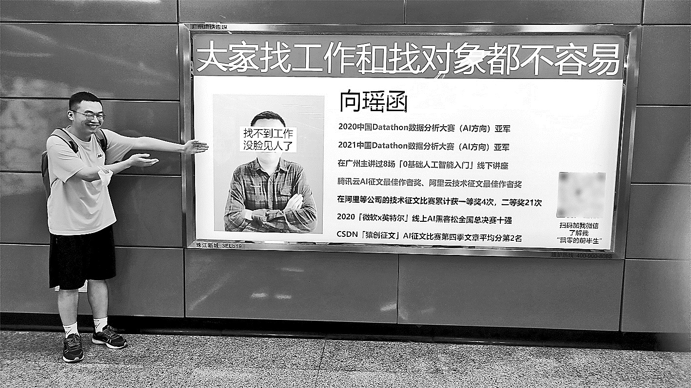 向瑶函是这则新闻的主人公,也是此后鼓励丁子明作出尝试的人。4月13日这天,在广州地铁珠江新城站B1出口,向瑶函的照片出现在一块醒目的广告屏幕上。“大家找工作和找对象都不容易”,广告屏上这句直白的话,配上他的简历和所获奖项,以及右下角的微信二维码,构成了一幅独特的画面。