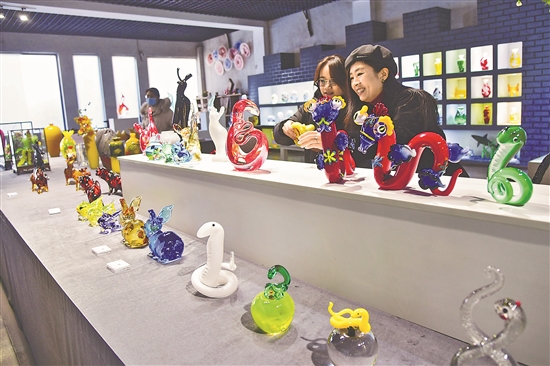1月9日,消费者在淄博市博山区西冶工坊展销厅内挑选蛇年主题琉璃工艺品。