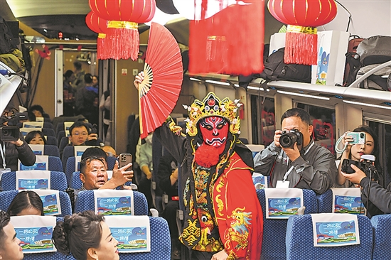 1月14日,演员在车厢内泼水送祝福。当日,“一路欢歌一路情”中老铁路跨国春节文化主题活动在D87次中老铁路国际旅客列车上举行,活动通过歌舞、魔术杂技等内容讲述中老铁路和沿线地区的发展变化,为旅客送上一场别开生面的新春文化盛宴。李嘉娴 摄/视觉中国