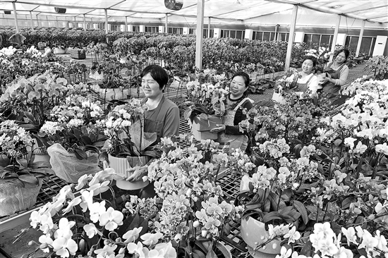 连日来,在该公司智能温室内,培育的红色“大辣椒”“红玛瑙”“雪玉”等十多个品种近10万株蝴蝶兰花卉长势喜人,员工们正忙碌着给蝴蝶兰组盆、做造型、包装,采取线上线下的方式销售到全国各地,抢占春节市场,目前该公司的蝴蝶兰已被各地客商订购过半。