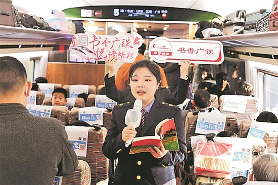 列车工作人员在车厢朗诵名人名篇。陈乐晗 摄
