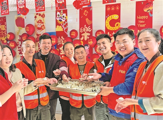 来自五湖四海、操着不同口音的工友齐聚一堂,挂灯笼、包饺子、贴春联、游园联欢、吃团年饭,浓浓的年味儿洋溢在工地上。图为工友相聚一起包饺子。