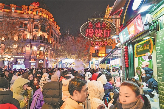 1月30日,游客在哈尔滨中央大街上的马迭尔冷饮厅购买冰棍。