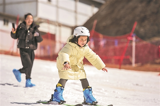近日,游客在昆明市轿子雪山室外滑雪场滑雪。