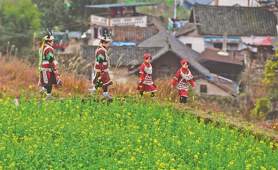 在贵州省凯里市舟溪镇舟溪村茶林苗寨,两对苗族双胞胎姐妹前往“甘囊香”芦笙堂参加芦笙节活动。