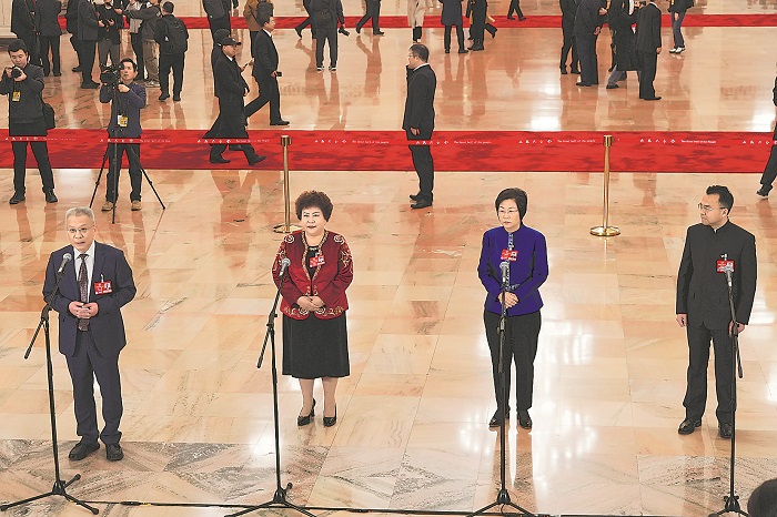 3月7日,全国政协十四届三次会议第二场“委员通道”开启。图为全国政协委员方忠、阿衣木沙·托合塔洪、徐凤芹、张朝晖(从左至右)走上通道,接受记者采访。本报记者 王伟伟 摄