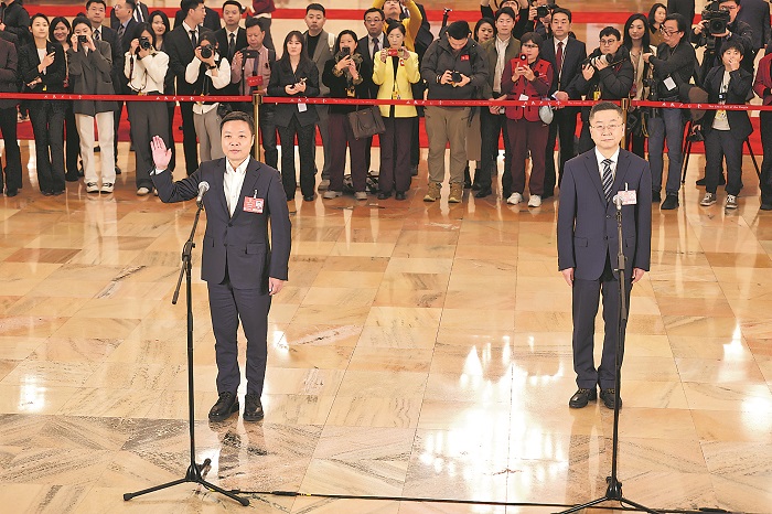 图为广东小鹏汽车科技有限公司董事长何小鹏代表(左),华工科技党委书记、董事长马新强代表(右)在第二场“代表通道”上接受采访。本报记者 吴凡 摄