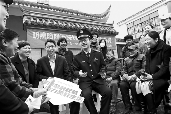 图为3月11日,金清镇市场监督管理所的党员干部和路桥区农商银行金清支行的党员志愿者,正在向群众开展消费维权普法和防诈骗宣传。本报通讯员 蒋友青 摄