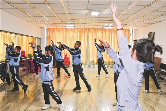 3月12日,四平市聋哑学校学生跟随老师练习手语韵律操。