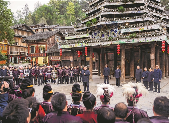 从鼓楼起身,村民们纷纷簇拥过来,热烈鼓掌,高声向总书记问好。习近平高兴地回应说,侗族人民朴实、勤劳、有文化、有智慧,希望大家在中国式现代化进程中把乡村振兴搞得更好,祝愿大家的日子越过越红火。离开侗寨时,侗族群众深情地唱起《侗歌声声唱给党》,表达对总书记的热爱和依依不舍。习近平频频挥手,同乡亲们道别。