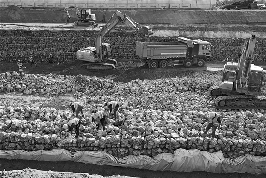 3月25日,工人在石家庄市东南退水明渠建设工地施工。