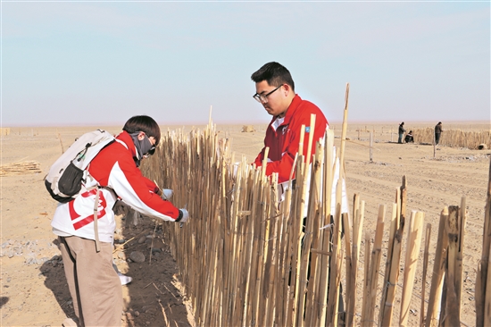 图为徐灿(右)在新疆和田地区皮山县参与治沙防沙工作。