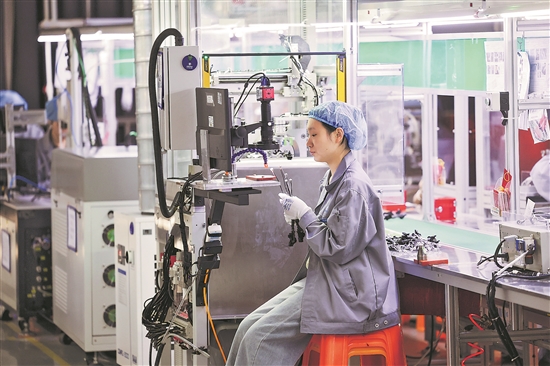 4月2日,位于浙江省湖州市吴兴区织里镇的浙江创特新材科技有限公司的线束车间内,工人在组装线束。