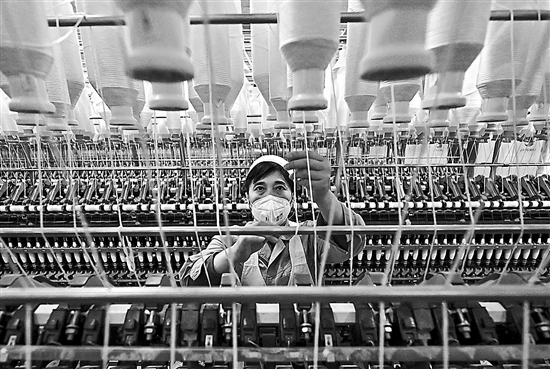 4月7日,在四川省眉山市仁寿县金鹅纺织有限公司生产车间,工人在生产线上工作。