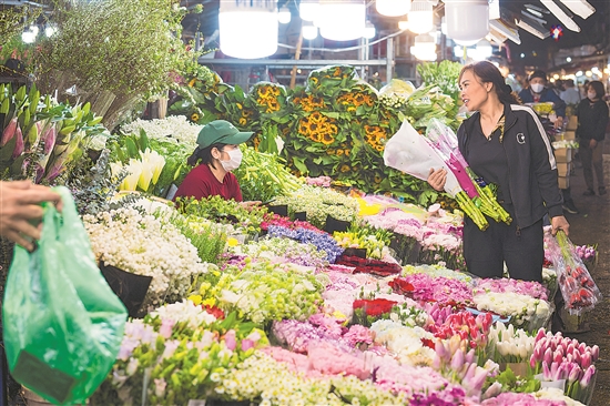 扎根花卉行业14年的越南老街花商阮翠云,自2018年起将云南花卉销往越南。随着网络销售平台的兴起,她积极与鲜花电商平台合作,如今从采购到物流均可在线完成。通过快捷的物流网络,云南的玫瑰、百合等主力品种次日便能从田间地头抵达越南河内的花市货架,完成一场跨越国界的“芬芳之旅”。如今,阮翠云平均每月会乘坐动车从河口到昆明进行采购,她创立的公司通过老街口岸,将云南优质花卉运往河内、胡志明等越南城市,让七彩“云花”成为越南家庭的常客。图为近日,一名女子在越南河内广霸花市购买鲜花。