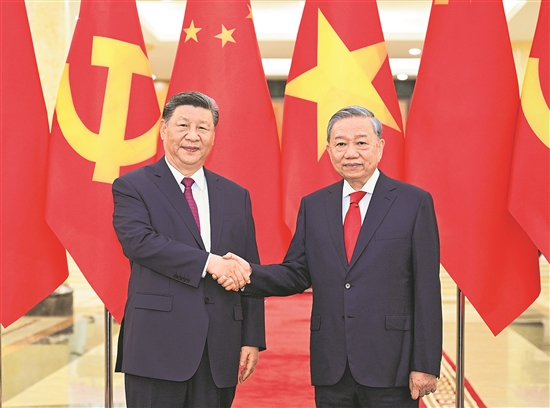 习近平强调,今年是中越建交75周年暨“中越人文交流年”。75年来,无论国际风云如何变化,双方在争取国家独立和民族解放的斗争中相互支持,在社会主义建设事业中携手并进,在推进各自现代化进程中砥砺前行,成为社会主义国家团结合作的典范。面对变乱交织的国际形势,中越两国坚持和平发展,深化友好合作,为世界带来了宝贵的稳定性和确定性。站在新的历史起点上,双方要继往开来、携手前行,赓续“越中情谊深、同志加兄弟”的传统友谊,按照政治互信更高、安全合作更实、务实合作更深、民意基础更牢、多边协调配合更紧、分歧管控解决更好的“六个更”总体目标,高质量推动全面战略合作,确保中越命运共同体建设行稳致远,为构建人类命运共同体作出新的更大贡献。
