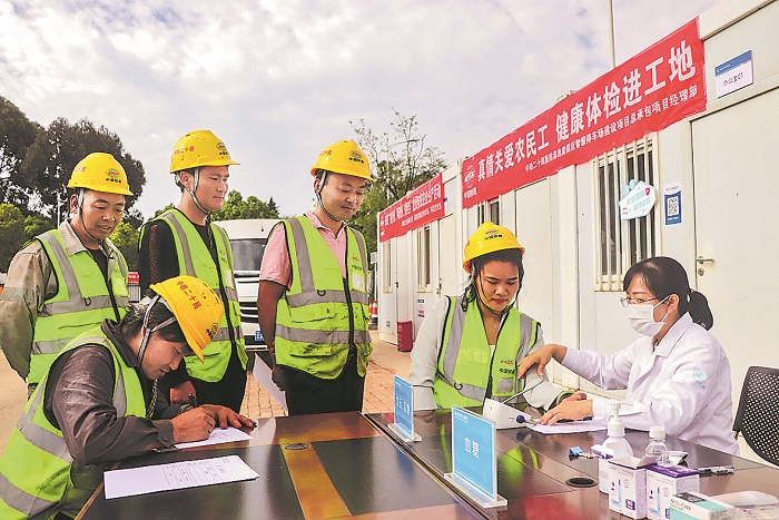 4月17日,在云南省昆明市,中铁二十局滇池度假区智慧停车场项目工会联合昆明市同仁医院,在施工一线开展“真情关爱农民工 健康体检进工地”专项活动,为20余名农民工提供免费健康体检,并组织安全生产教育培训。活动通过将医疗服务与安全教育送到工地,切实保障农民工的身心健康与作业安全。本报记者 赵黎浩 摄