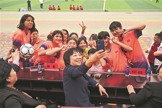 4月12日,2025新疆克孜勒苏柯尔克孜自治州足球联赛在阿图什市开幕,前中国国家女子足球队球员孙雯出席开幕式。姑娘们激动地与偶像孙雯合影,并说:“长大后我想成为你!”