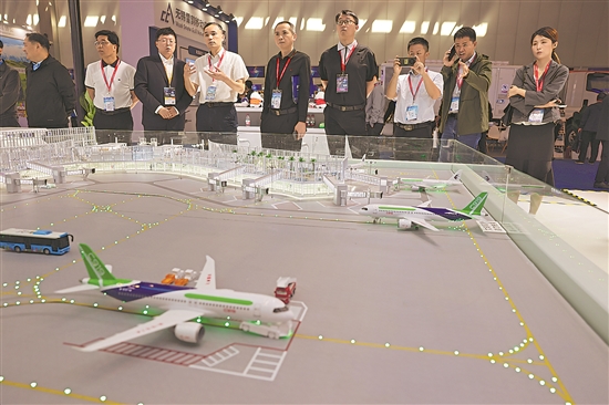 本届展会将围绕“民航数智化发展建设”及“民航数据化资产经营”等主题举办专业论坛活动。图为参展商向观众介绍相关产品。