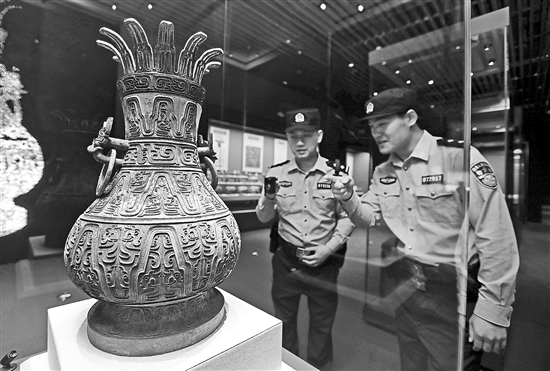 4月22日,在湖北省京山市苏家垄遗址博物院,京山市公安局坪坝派出所民警对曾伯桼壶等珍贵铭文青铜重器展厅的监控系统进行隐患排查,确保文物安全。连日来,湖北省京山市公安局与文旅等多部门联勤联动,对辖区重点文保单位及旅游景区开展安全隐患大排查,严格规范景区治安、交通、市场经营秩序,为即将到来的“五一”假期文旅高峰筑牢安全屏障。