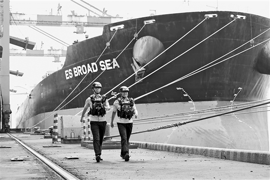 近日,在山东港口日照港,日照出入境边防检查站民警穿戴智能头盔、云甲等警务装备开展巡查工作。