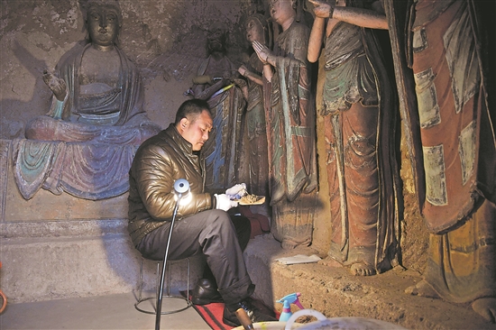 经过多年磨砺,牟常有的文物修复技艺日臻成熟,面对年轻人的请教,他更是倾囊相授。“塑像壁画皆是凝固的历史,守护它们,需要耐心和毅力,相信年轻人能够接好接力棒,让这份珍贵的人类文化遗产永续。”牟常有说。