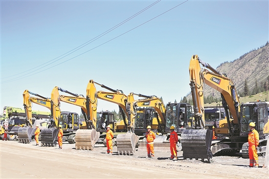 巴尔斯科恩-别迭里公路项目开工仪式日前在吉尔吉斯斯坦伊塞克湖州巴尔斯科恩村举行。中吉两国约300人参加活动。巴尔斯科恩-别迭里公路项目起点位于吉尔吉斯斯坦伊塞克湖南岸的巴尔斯科恩村,终点为吉中边境的别迭里口岸,全长约150公里,由中国路桥工程有限责任公司承建,预计2030年建成。该公路建成后有助于深化两国互联互通、提升贸易便利化水平。图为在吉尔吉斯斯坦巴尔斯科恩村举行的开工仪式现场上拍摄的工程机械。