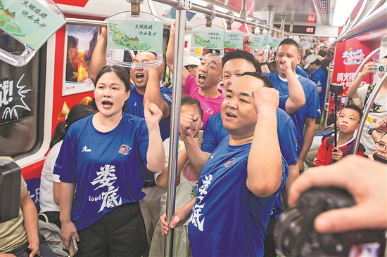 9月7日晚,湖南省足球联赛(简称“湘超”)揭幕战在长沙市贺龙体育中心打响,由娄底队客场挑战长沙队。当天,不少球迷乘坐主题为“娄底号”的地铁前往观赛。这列地铁不仅是一种交通工具,更是娄底市向全省发出的一张“邀请函”。
