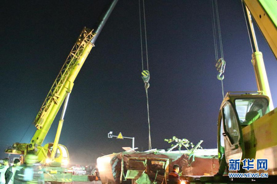 10月5日,吊车正在起吊在河南林州发生侧翻事故的客车。刘剑昆 摄