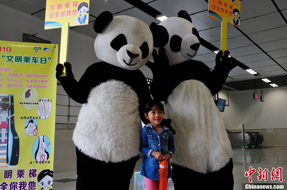 10月11日是成都地铁第二个文明乘车日,两只“大熊猫”来到地铁2号线西延线犀浦站引导乘客安全文明乘车,与此同时地铁安全文明乘车示范课堂也正式启用。图为可爱的“大熊猫”吸引孩子们。阿文 摄