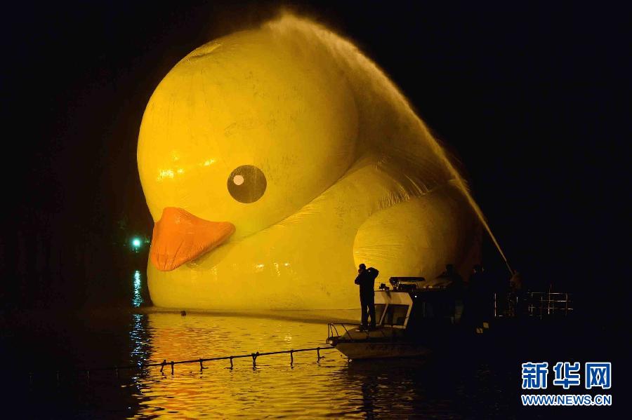 由于北京10月10日出现大风天气,颐和园启动大黄鸭防风预案,将大黄鸭人工放气,避免其遭受大风损害。经过一天检修,颐和园11日晚间开始为大黄鸭充气,并安排消防艇为黄鸭“冲澡”。12日,大黄鸭将以新的面貌继续在颐和园展出,与公众见面。新华社记者 李鑫 摄