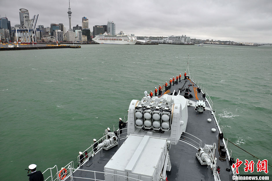 当地时间10月11日10时,由北海舰队导弹驱逐舰青岛舰、导弹护卫舰临沂舰、综合补给舰洪泽湖舰组成的中国海军出访舰艇编队抵达新西兰奥克兰,开始进行为期4天的友好访问。图为中国海军导弹驱逐舰青岛舰驶抵新西兰奥克兰港王子码头。中新社发 胡善敏 摄 图片来源:CNSPHOTO