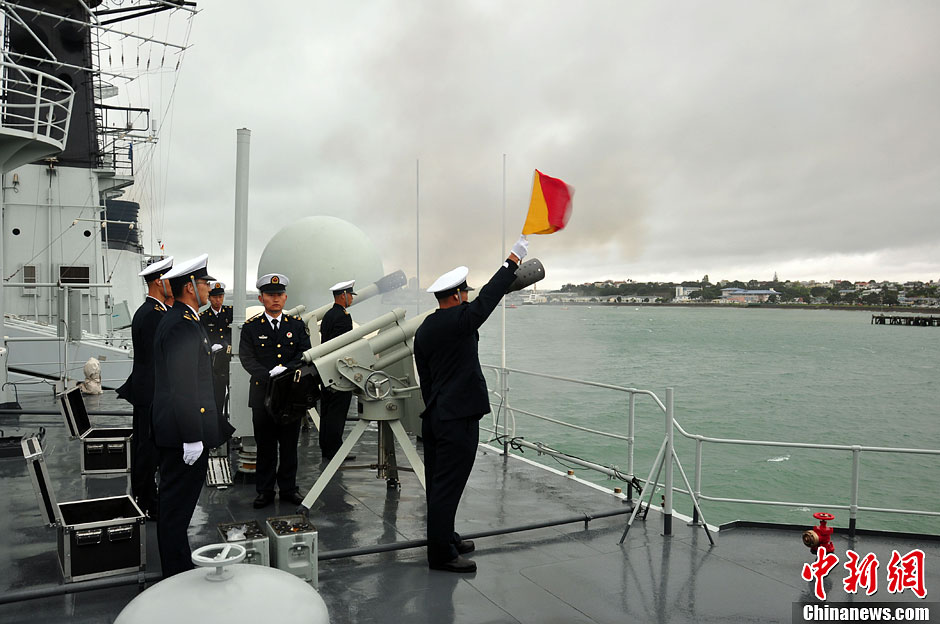 当地时间10月11日10时,由北海舰队导弹驱逐舰青岛舰、导弹护卫舰临沂舰、综合补给舰洪泽湖舰组成的中国海军出访舰艇编队抵达新西兰奥克兰,开始进行为期4天的友好访问。图为青岛舰官兵鸣放礼炮。中新社发 胡善敏 摄 图片来源:CNSPHOTO