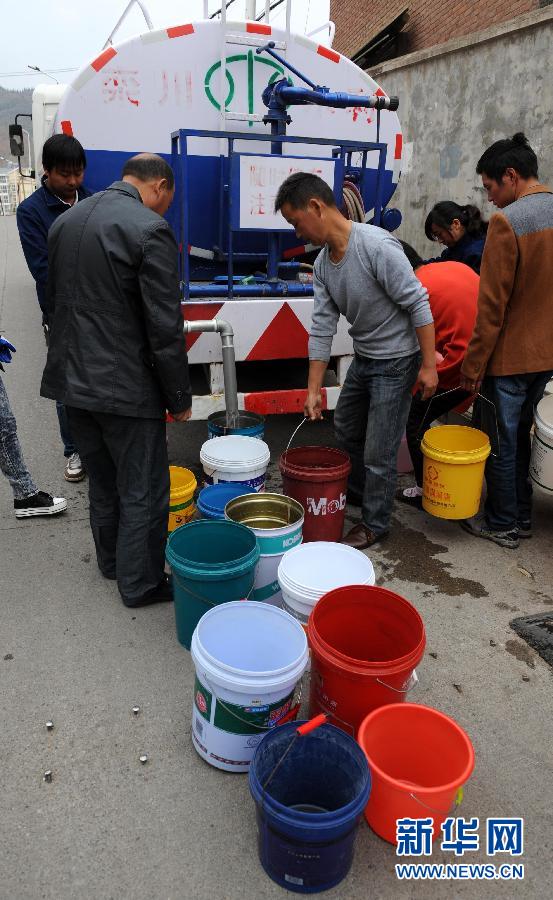 10月16日,在栾川县第一高级中学取水点,附近的居民在抗旱服务队送水车前取水。2013年1月以来,河南省洛阳市栾川县降雨持续偏少,出现春、夏、秋三季连旱,截至9月底,栾川县全县有效降雨累计为367.6毫米,为历年平均降雨量的43%,该县有20万人饮水因此受到影响。在栾川县城区四个供水水源地中,石笼沟水库、大南沟水库和龙潭水库已经干涸,仅有九鼎沟水库靠径流水每日7000立方米供应县城用水,目前用水缺口达每日2.1万立方米。栾川县协调组织力量,在旱情较严重的地区采取送水、挖掘水源等多项措施,以解决群众用水困难问题。新华社记者 李博 摄