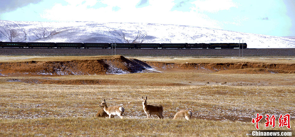 10月18日,一群藏原羚在青藏公路边觅食,远处是青藏铁路。记者在青藏公路沿线的三江源保护区看到,很多野生动物在公路边悠闲散步觅食。随着保护力度的加大,野生动物种群数量恢复明显,以前很难看到的藏野驴、藏羚羊等动物如今在青藏公路边随处可见。中新社发 赵凛松 摄